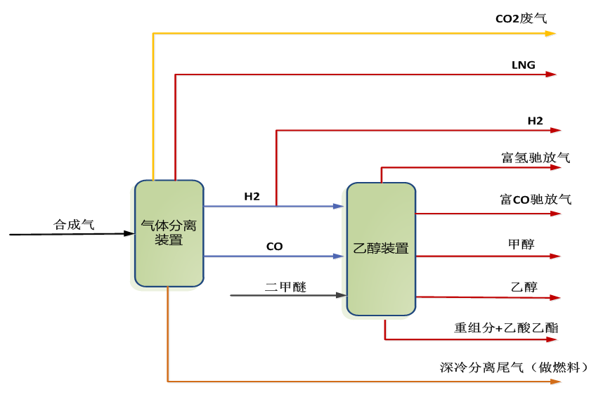 該項(xiàng)目主要產(chǎn)品乙醇、甲醇、氫氣、LNG、重組分及乙酸乙酯。項(xiàng)目擬采用合成氣和二甲醚為原料:外來合成氣經(jīng)MDEA脫碳后,進(jìn)入氣體分離裝置,氣體分離裝置采用深冷分離+PSA工藝路線生產(chǎn)H2、CO,同時(shí)副產(chǎn)LNG及深冷分離尾氣(做燃料)。外來二甲醚與CO、H2進(jìn)乙醇裝置生產(chǎn)乙醇產(chǎn)品,同時(shí)副產(chǎn)甲醇、重組分及乙酸乙酯產(chǎn)品。