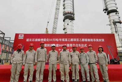 6月8日,由公司EPC總承包的榆神能化50萬噸/年煤基乙醇項目乙醇精制塔吊裝封頂暨800噸履帶吊交車儀式在乙醇裝置現(xiàn)場隆重舉行。公司總經(jīng)理助理田平漢出席儀式并講話,榆神能化公司執(zhí)行董事、支部書記李軍林,總經(jīng)理、支部副書記郭尊禮,以及各參建單位相關(guān)負責(zé)人等參加了儀式。