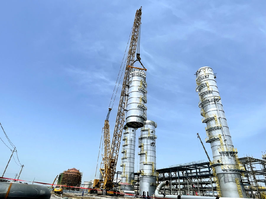 乙醇精制塔上塔上段直徑7.8米,吊裝總高74.4米、總重約220噸,吊裝主吊采用1250噸履帶吊,400噸履帶吊溜尾。設(shè)備于4月16日11時(shí)18分起吊,經(jīng)過(guò)2小時(shí)完成組對(duì)合口,順利啟動(dòng)焊接工作,預(yù)計(jì)焊接工作將持續(xù)4至5天。