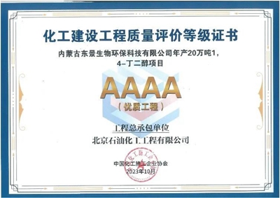 近日,中國化工施工企業(yè)協(xié)會公布2023年化工建設(shè)工程質(zhì)量評價(jià)結(jié)果,北京石油化工工程有限公司總承包的“內(nèi)蒙古東景生物環(huán)保科技有限公司年產(chǎn)20萬噸1,4丁二醇(BDO)項(xiàng)目”榮獲化工建設(shè)工程質(zhì)量評價(jià)4A級(優(yōu)質(zhì)工程)。